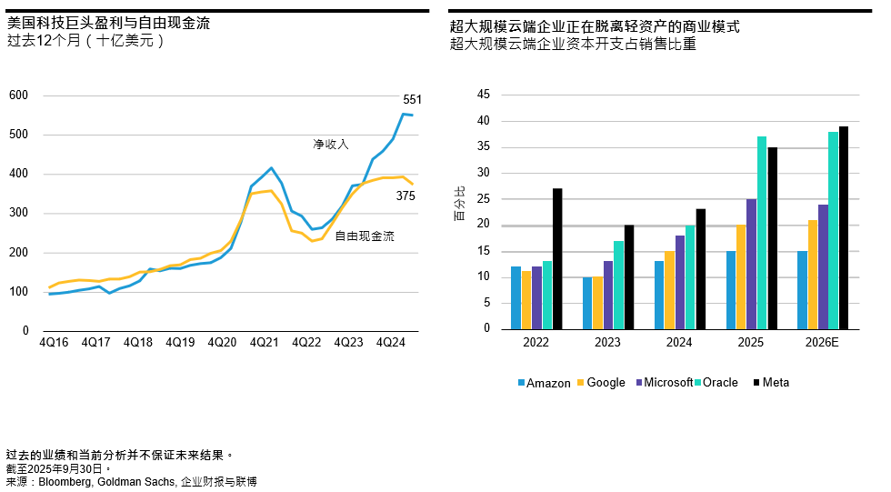 2025年的全球股市很大程度上是由AI主题驱动的,美国科技巨头不论从盈利角度还是股价角度均支撑了美股表现。我们认同,AI无疑是长期的结构性机会,但短期的市场表现已出现过热迹象。一方面,投资者对AI主题的狂热带动了对于质量较低、盈利不佳科技股的投机行为。另一方面,主要大型云端公司(Hyperscalers)的资本开支大增,使得这些过去以软体作为主要服务的企业正逐渐脱离轻资产模式,这对未来的自由现金流构成了潜在压力,也显著增加了折旧摊销支出。这将使得这些企业,甚至是美股,自金融海啸以来的估值扩张趋势面临挑战。