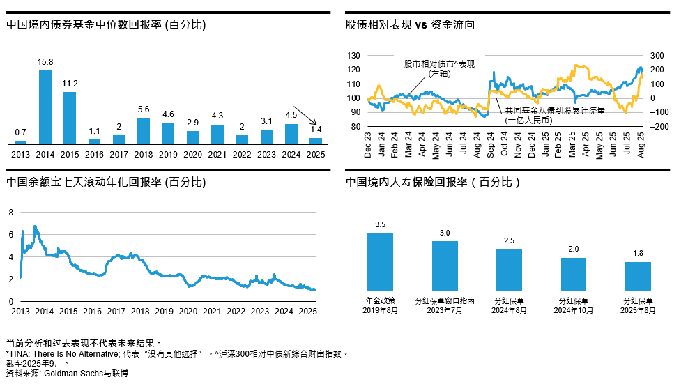 此外,随着中国无风险利率在维持宽松货币政策的背景中持续下行,债券市场的预期回报率已有所压缩,难以满足中国机构与零售投资者对于收益的需求。相比之下,A股市场的股息率优势,尤其是在新“国九条”出台后,正在浮现。对于追求收益的国内资金而言,股市正逐渐成为“别无选择”(TINA*: There Is No Alternative)的配置方向。我们观察到,资金正从债市流向股市,保险资金和理财资金对红利类资产的需求正在持续提升。这一趋势在2026年大概率将延续,为市场提供更稳定的底部支撑。