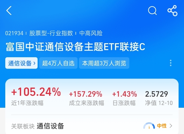 今天市场又陷入震荡模式,阶段性回调说来就来,这种时候真的不能急着出手,慢慢低吸、稳扎稳打才是硬道理。我刚小仓位布局了$富国中证通信设备主题ETF联接C$ ,它紧跟通信设备指数,业绩挺不错的。让人惊喜的是,这只基金近一年收益率高达105.24%,在同类里排名靠前,先小试牛刀,继续加油啦。