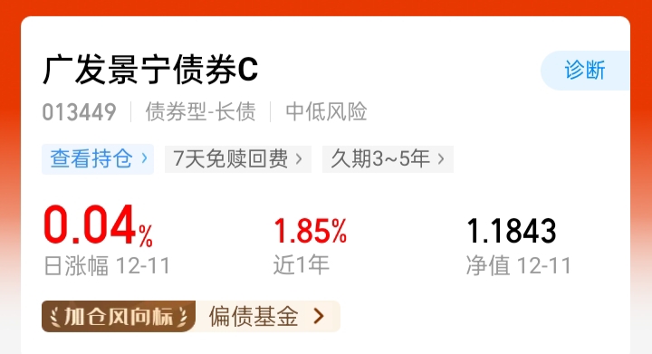 今天广发景宁收4蛋,连续3天收蛋,近1年涨幅1.85%,超过大多数利率债基!