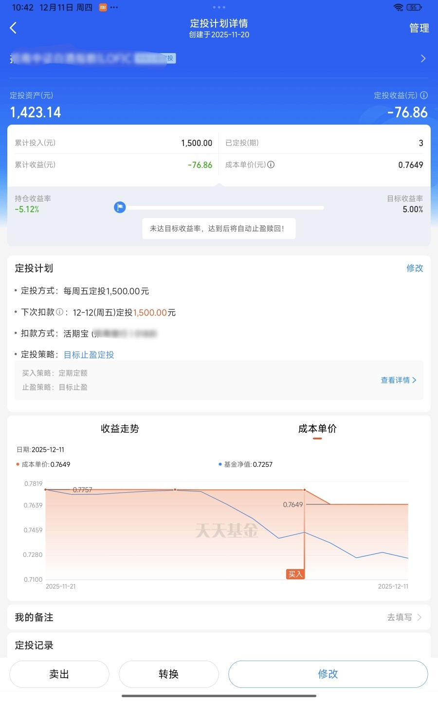 选择的行业指数基金,每周定投500,目标5%,下跌了5.12%了。已经定投3期了,明天第4期,定投金额加倍处理。