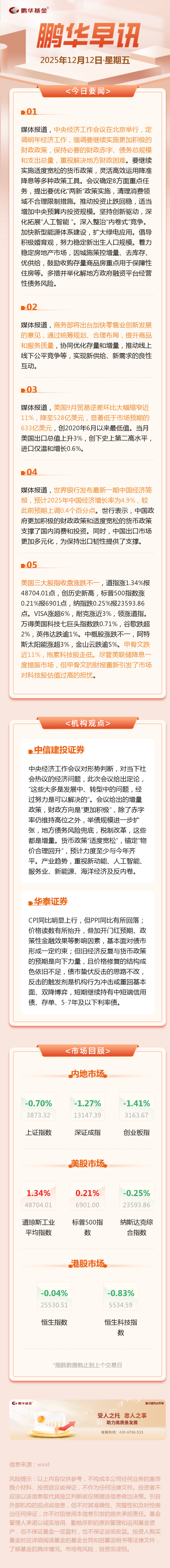 鹏华早讯12.12 中央经济工作会议在北京举行,定调明年经济工作