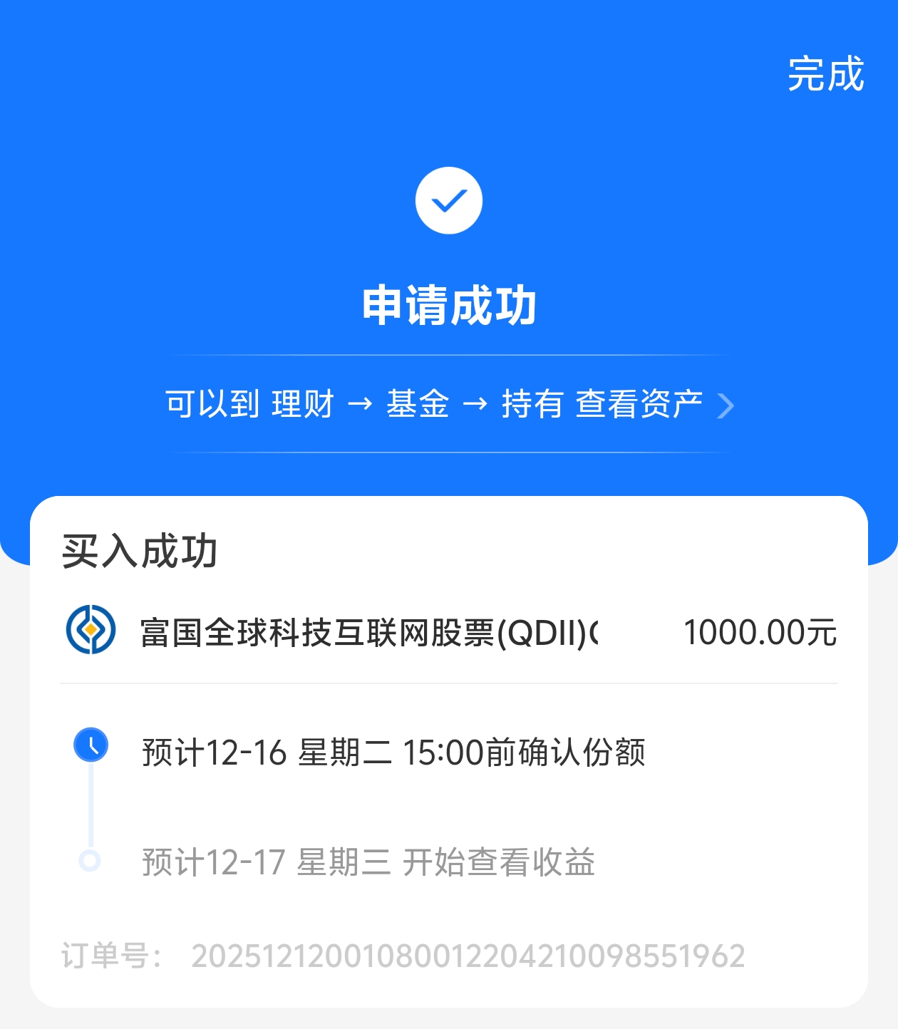 整理持仓时意识到,配置一些面向全球的科技资产还是挺有必要的。$富国全球科技互联网股票(QDII)C$ 这只基金涵盖从硬件到服务的完整链条,等于把创新生态打包在了一起。它不追逐短期爆点,而是随着产业趋势自然成长,这种特性适合作为组合里的“压舱石”。我今天又放了1000元,金额不大,重在持续。投资有时不必追逐最亮的那颗星,找到能长期发光的就已足够。