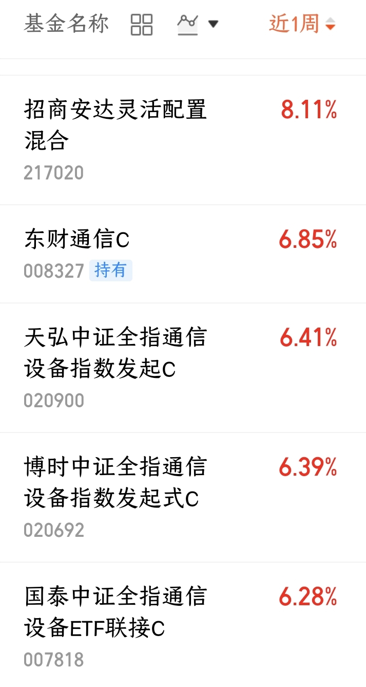 $东财通信C(OTCFUND|008327)$近一周涨幅6.85%