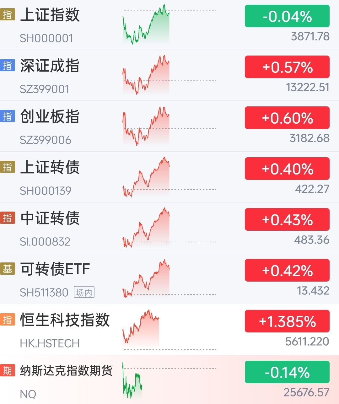 中午好,今天隔壁开始修复,截止到午间估值收益已经拉红,指数方面一绿两红,上证指数今天目前来看算微调-0.04%幅度不大,深证成指+0.57%,创业板指+0.60%,转债晴天,恒科晴天,纳指期货小绿0.14%!