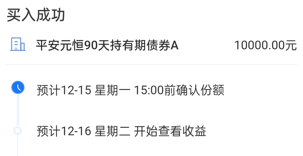 个人今天继续领红包上车一万元!平安元恒这段时间收蛋量真是表现的出圈,前天收11个,昨天收9个,近一周就收30个,近期债市一回暖表现真是不错的,长期来看元恒近一年年化收益率3.66%,最大回撤才22个蛋,真是稳健的同时又兼备了不错的产蛋量!90天时间也不算太久,有时候管住手也是好事,可是避免来回操作错过行情!马上年关了,我个人觉得找个博文的地方把闲置资金放进来也不错,还有红包可以领取,今天再发车一些!