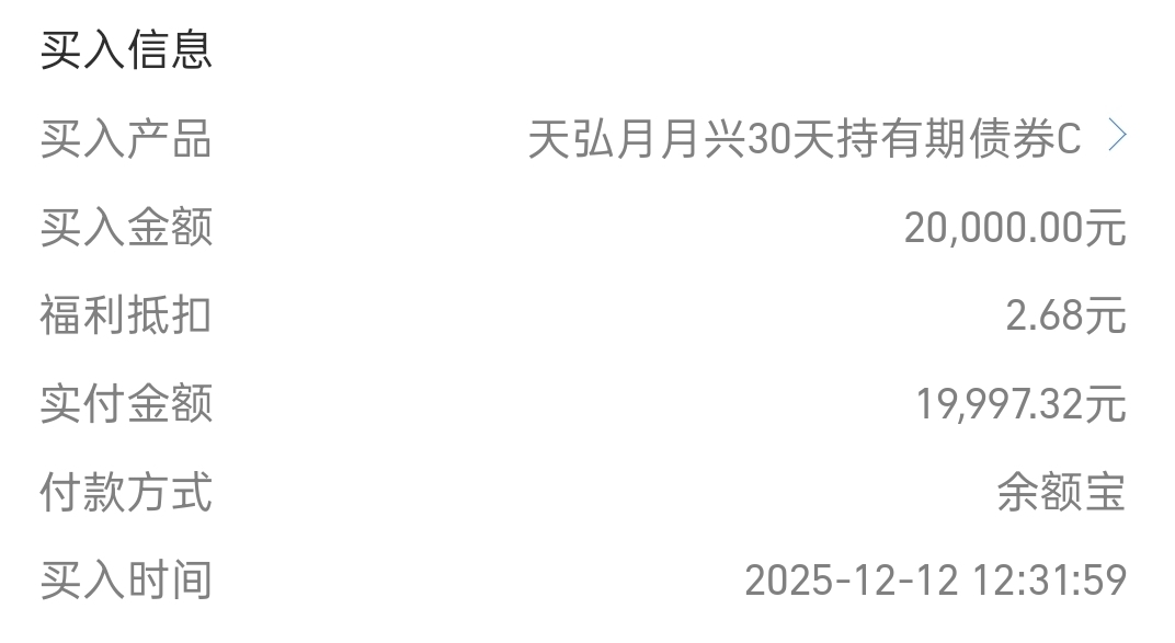 $天弘月月兴30天持有期债券C$ 拆包上车2万,评论区往下滑六楼有,薅羊毛更有性价比!这只中短债策略基金,最让我放心的就是稳定性很好,波动小,拿着安心。30天持有期不算长,避免频繁操作,也能保持一定的灵活性。更关键的是收益也不错,近一年收益率2.43%,跑赢同策略平均值1.61%,在同策略里也是优等生。近一年最大回撤仅0.11%,而且19天完成修复,收益和稳定性双在线。现在市场轮动较快,我把大资金放在稳当,回撤低的方向更踏实。即能避开市场波动,还能在低利率环境里跑赢传统理财。今天个人继续加一笔,就当强制存钱了!