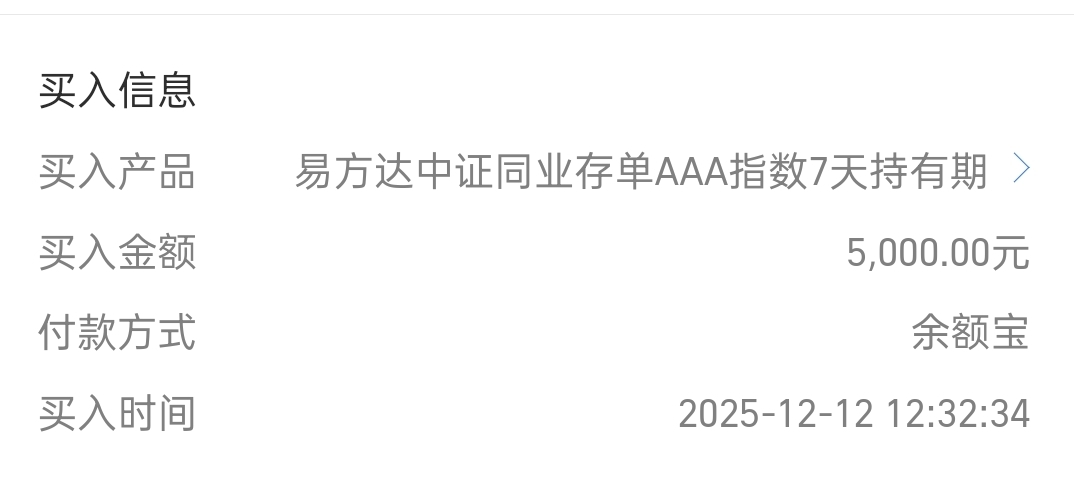 $易方达中证同业存单AAA指数7天持有$ 今天个人向稳健的同业存单发车5000元!不想体验波动,还想要跑赢货币,小师妹觉得同业存单是个不错的选择,在锁定收益的同时还能跑赢银行存单和货币。近一年1.55%的年化收益率,看着不算特别高,但胜在稳,收益不错的同时,回撤控制的也是相当好,近一年最大回撤只有0.09%,几乎没有太大的波动,持有感也特别安心。而且还是7天持有期很灵活,锁定收益的同时也不耽误应急。近期无论是隔壁还是债市波动都不小,思来想去还是同业存单安全,拿的住,赚的到,今天个人再加一些,稳稳的幸福才最香!