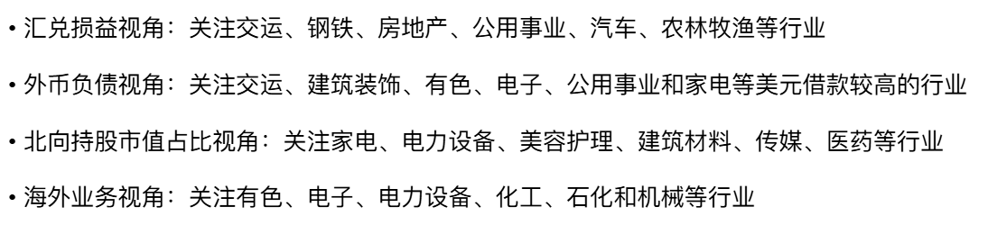 华鑫证券建议投资者可从四大视角寻找受益方向:汇兑损益视角、外币负债视角、北向持股市值占比视角和海外业务视角。 从海外业务视角看,利好有色、电子、电力设备、化工、石化和机械等行业。