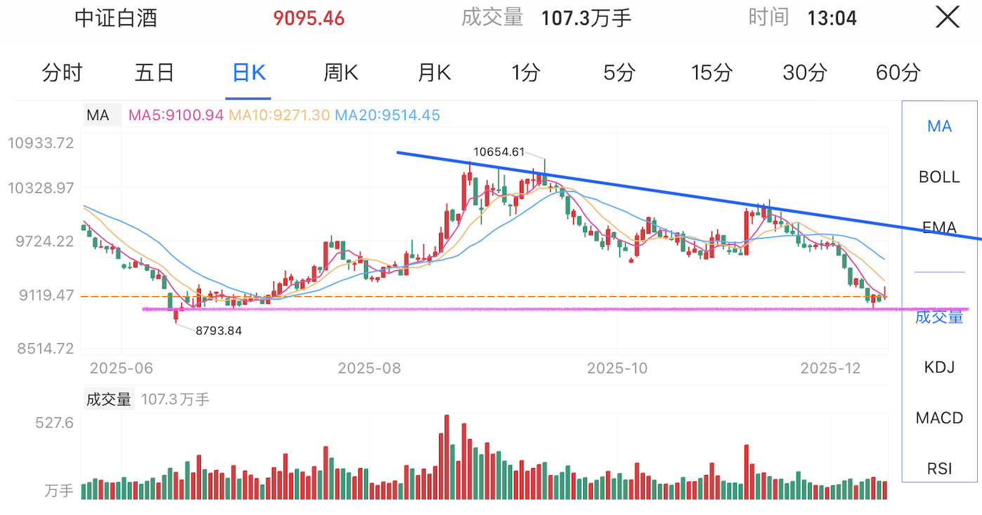白酒:持续在底部区间缩量震荡,受制于清晰的下降趋势线压制,且位于所有关键均线下方,走势极弱。目前股价已逐渐逼近历史低点,在普跌的市场背景下,其能否坚守住现有支撑位将是短期内关注的重点。