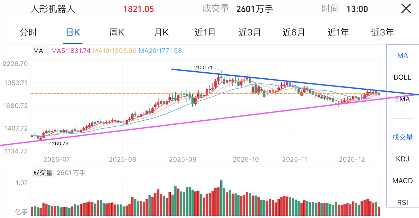 人形机器人:处于长期上升趋势中,短期已进入收敛三角形态整理的尾声。技术上,突破下跌趋势线是开启新一轮上升行情的关键。如果突破失败,可能继续维持整理形态,甚至面临向下跌破支撑位、回踩更低支撑的风险。