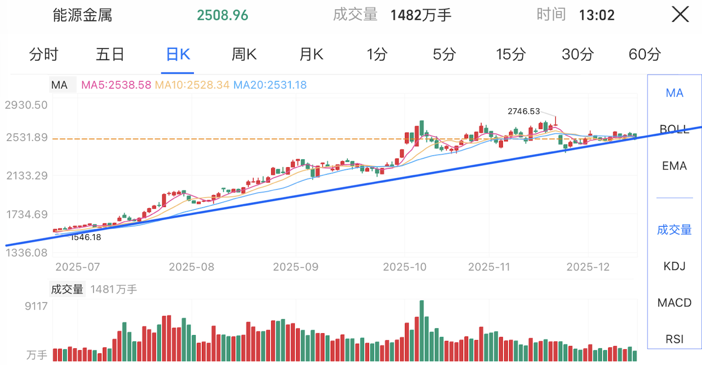 能源金属:近期回调至前期低点支撑位后开始窄幅震荡,展现出较强的底部韧性。尽管具备在基本面积极催化下迎来强劲反弹的潜力,但当前成交量能持续不足,需警惕其向下寻找更深底部支撑的可能性。