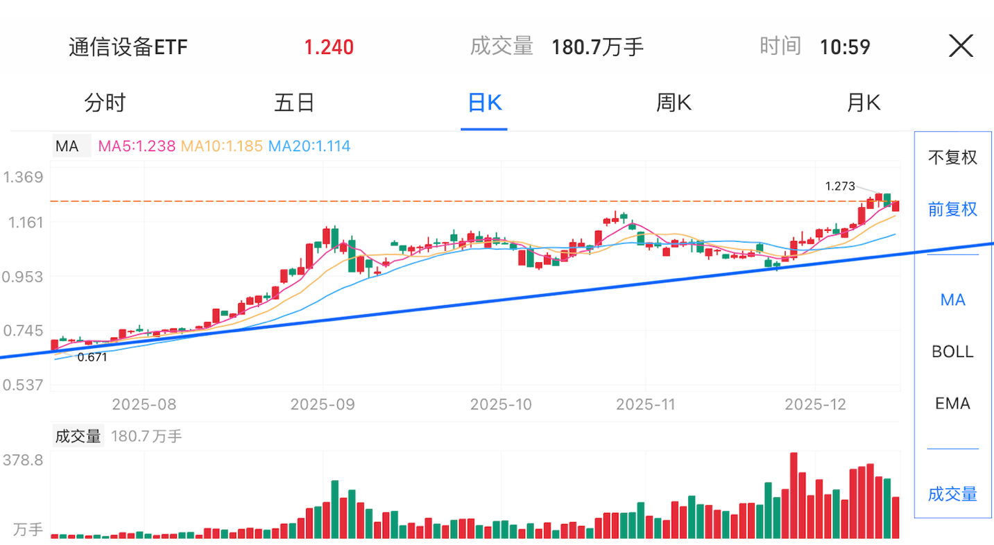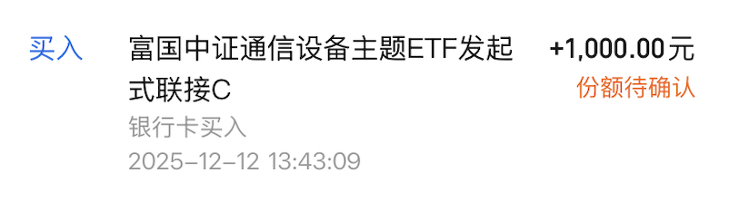 今日加仓1000。近期,AI 算力基础设施的预期提升,芯片与算力链条景气度进一步得到确认。通信设备板块因此强势拉升,重新成为领涨主线。从技术面来看,通信设备已明确突破了长期高位整理平台。趋势已得到多重确认,且成交量同步显著放大,形成了完美的价量配合。这两日在小幅回调后迅速反攻,已进入加速上攻的关键期。本基紧跟该指数,纯度高,能够直接受益于 AI 算力基础设施建设带来的长期需求增长。其跟踪指数历史表现位列同类前茅,最近更是同类居首。本人继续布局。