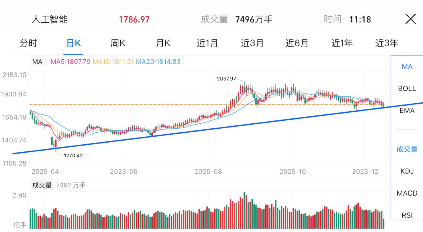 今日加仓1000。人工智能(AI)在回调后止跌于关键长期上升趋势线,同时量能放大,预示着有望迎来新一波行情。基本面,AI的成长逻辑依然坚实。随着算力扩张、模型升级以及“AI+应用”的全面铺开,叠加政策与产业周期的强劲共振,为长期的成长提供了扎实的基础。本基布局AI产业链核心资产,具备主动挑选优质标的的优势,且费率低廉。本次在指数回调至长期趋势线的关键支撑位时,本人视为一次绝佳的试探性加仓窗口,持续布局这条确定的科技主线。