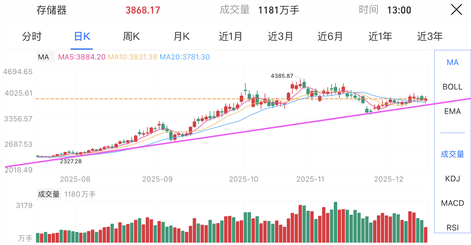 存储芯片:保持中长期上升趋势,但短期冲高回落,正在上升趋势线附近进行窄幅震荡整理。关注其能否放量突破前期高点压力,这或将是新一轮上涨行情的启动信号。若未能突破,预计将继续在现有支撑位附近 盘整筑底,以等待更强劲的基本面催化。