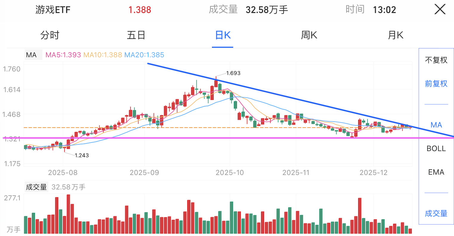 游戏:在下行过程中目前呈现止跌横盘态势,短期内仍受下降趋势线压制,走势偏弱。 放量有效突破下降趋势线是其估值修复的关键信号。若无法突破,预计将继续在底部区间震荡磨底,甚至存在跌破底部支撑的风险。
