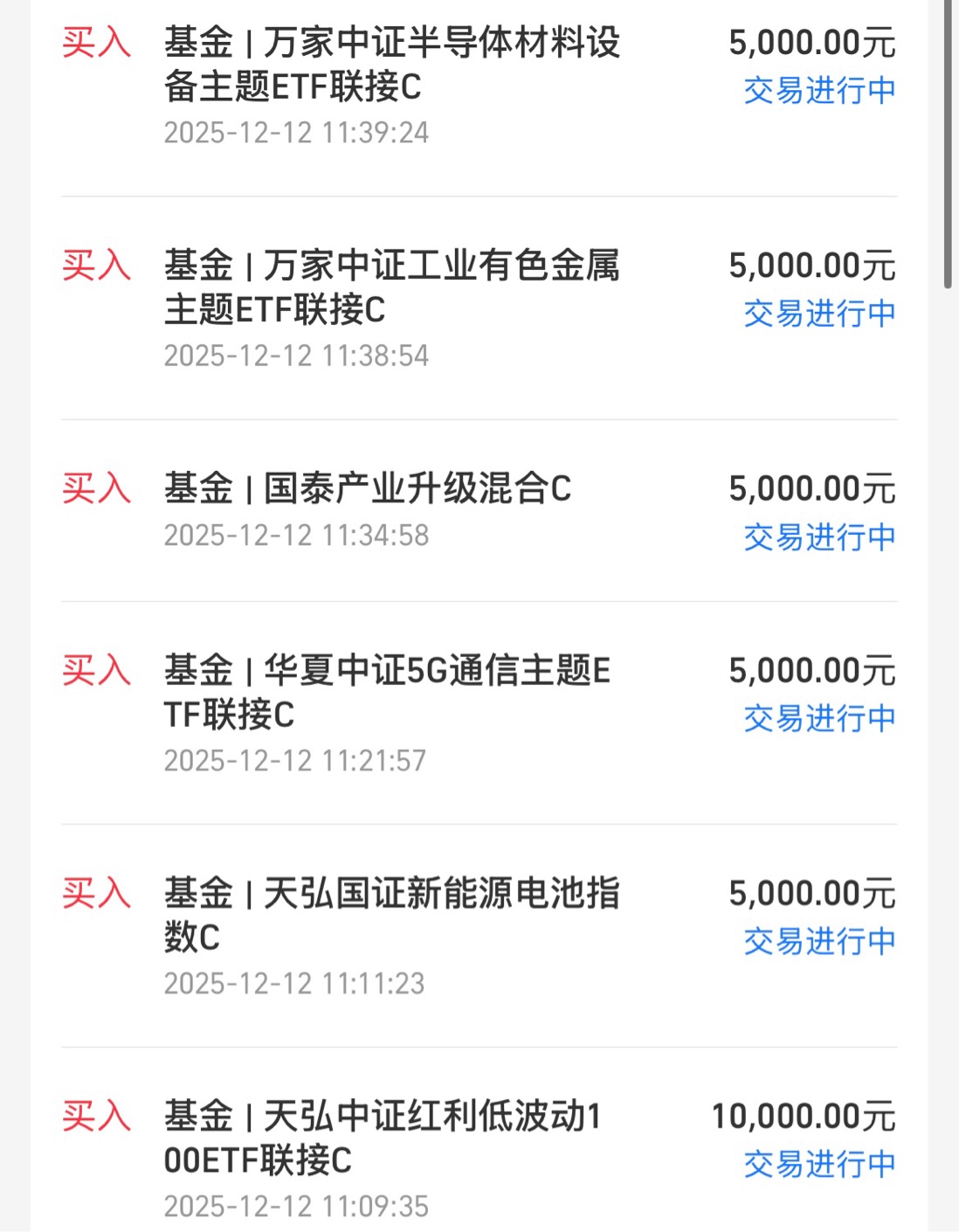 1. 5G通信,上车5000,$华夏中证5G通信主题ETF联接C$ 昨天跌了3%不敢出手,今天上涨1%,个人加仓5000,5G通信涵盖通讯设备、光膜组件CPO,在人工智能推动下CPO龙头业绩大超预期,经历了十一月短暂整理,重回顶峰,强者恒强逻辑没有改变