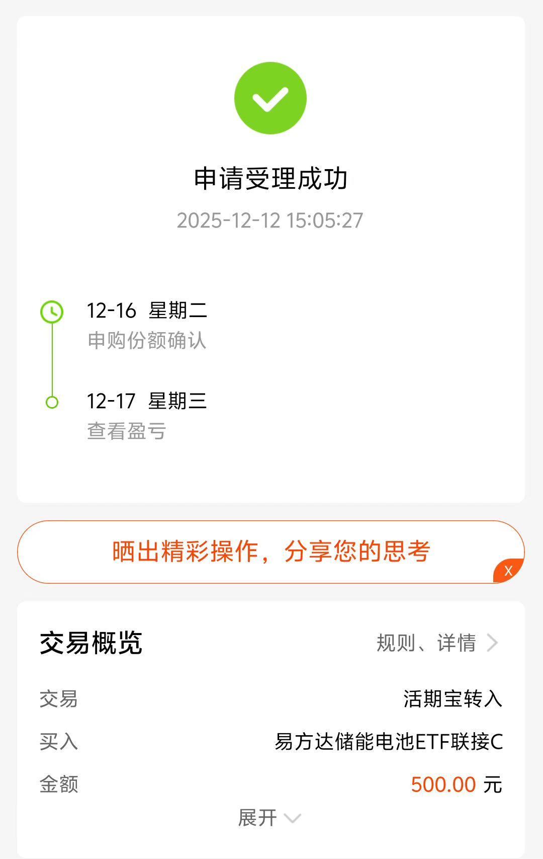 大盘今天太给力了,三大指数拉升翻红,储能电池板块今天表现还不错,涨了不少呢,储能电池指数是主投储能板块的产品,今天加仓易方达储能电池ETF联接C500元,今天预估涨1.29%,近六个月涨了51.27%,看好这个方向,我准备分批布局了!