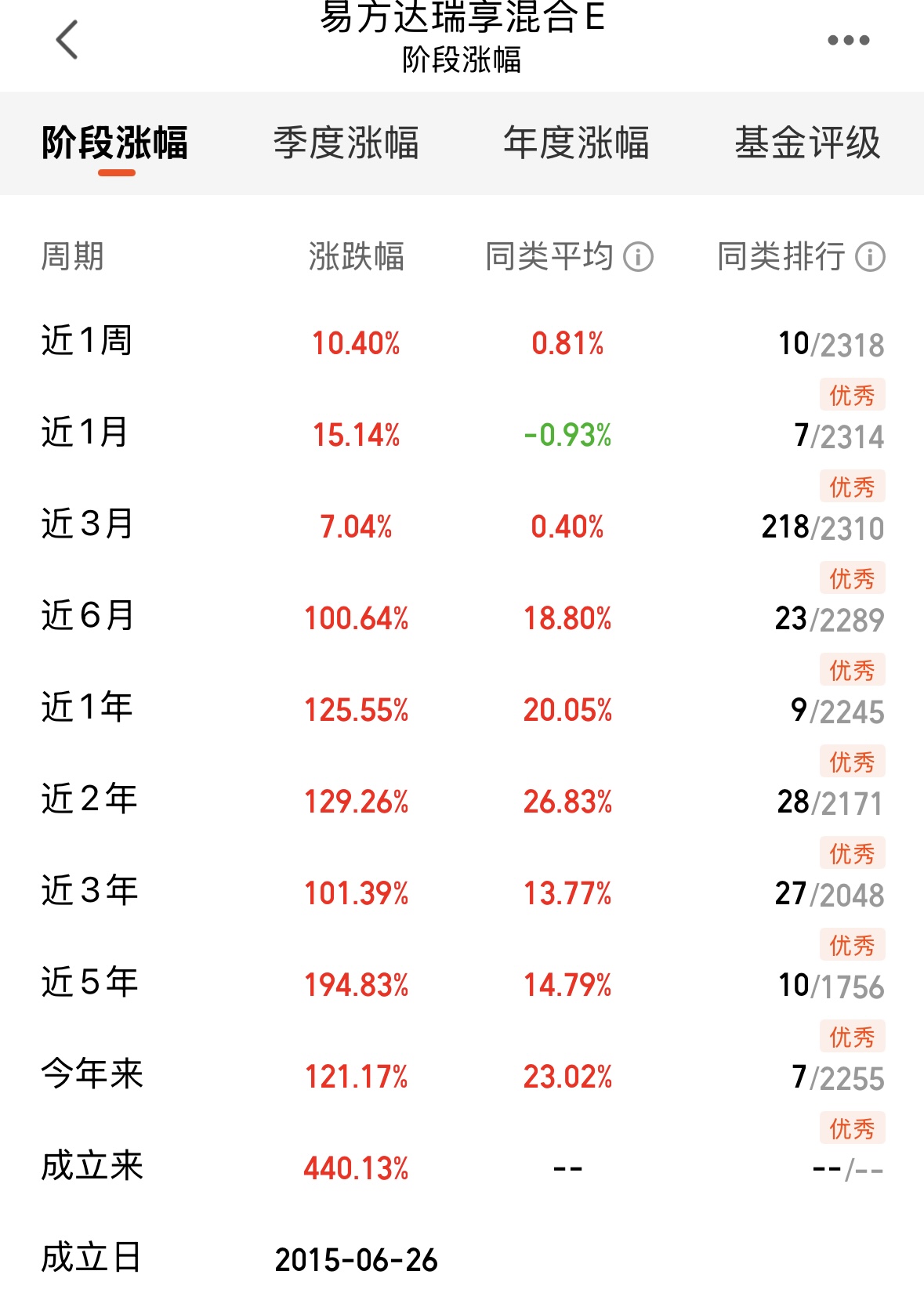 易方达瑞享E最近的净值表现,真的很强,近一周10%,近一月15.14%,成立以来440%,比同类赚的久。