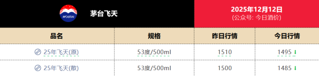 茅台跌破零售价:25年飞天茅台(原箱)较前一日下跌15元,报1495元/瓶;25年飞天茅台(散瓶)较前一日下跌15元,报1485元/瓶,跌破官方零售价1499元。