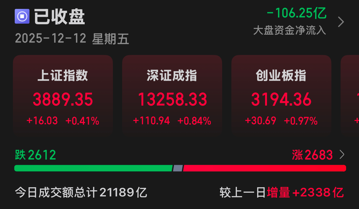 指数表现,沪指涨0.41%,深成指涨0.84%,创业板指涨0.97%。个股涨跌相当,全市场2683只个股上涨,下跌个股2612只。沪深京市场全天成交额2.11万亿,较上个交易日增量2338亿。