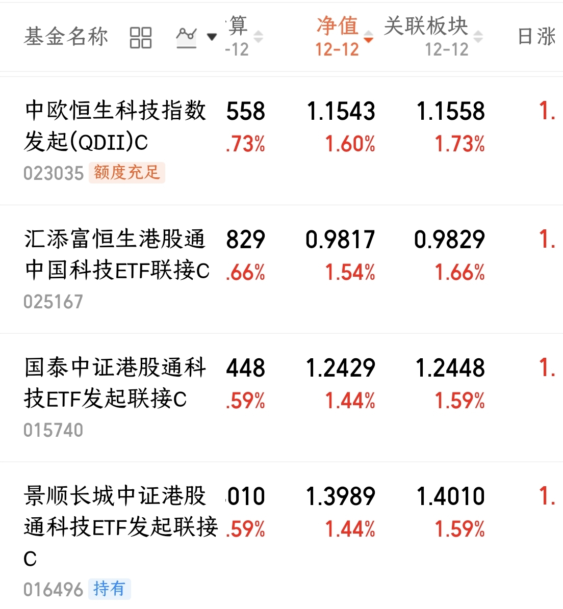 $汇添富恒生港股通中国科技ETF联接C(OTCFUND|025167)$今日上涨1.54%
