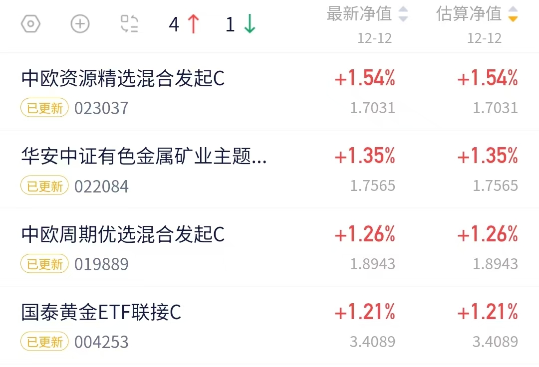 家人们感觉12月的市场行情还是很香的~我感觉资源板块基本面还是没有什么变化的,在利好的带动下行情还会一直持续的,我看$中欧资源精选混合发起C(OTCFUND|023037)$今天收涨1.54%,他家的中欧-周期优选混合发起C收涨1.26%还是很香的呀~