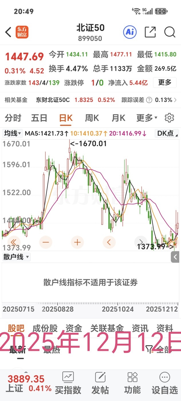 今天A股沪、深、北三个市场五只主要指数全部上涨,其中科创综指领涨,涨幅达到了1.77%,上证指数、北证50殿后,涨幅分别是0.41%和0.31%;从均线运行状态分析,接下来上涨较稳定的可能是北证50,该指数自10月底向下调整至今己有一个多月的时间,跌幅在五只指数中也是最大的一只,同时其在11月中旬后期止跌成功,近几日开始脱离底部向上运行,特别是昨天涨幅达到了3.84%,今日又继续上涨,目前已稳在20日均线的上方,因此继续补涨的可能性很大。