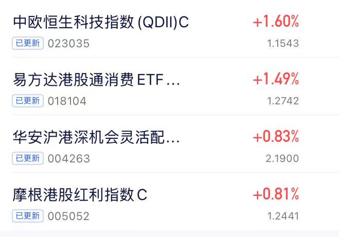 今天大盘低开高走,随着指数的探底回升,整体行情反弹明显,隔壁港股这边也同步上涨了,来看具体基的净值更新概况: