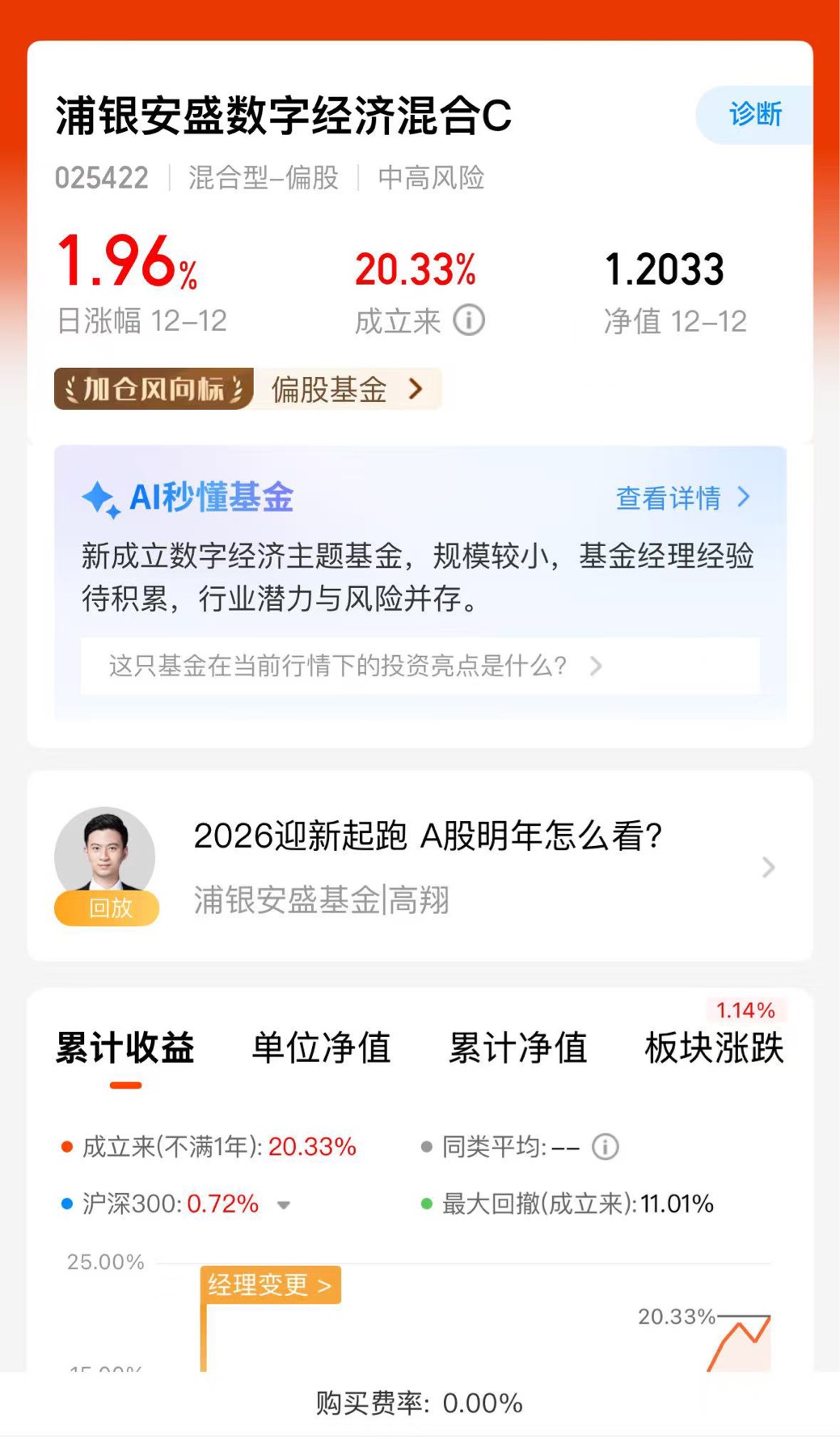 #国际银价涨疯了!现在上车还来得及吗?# $浦银安盛数字经济混合C$ 单日上涨1.96%,15个交易日只跌了2天,近一周涨了13%,能涨抗跌,真的太神了!#美联储宣布降息25个基点 如何布局?#