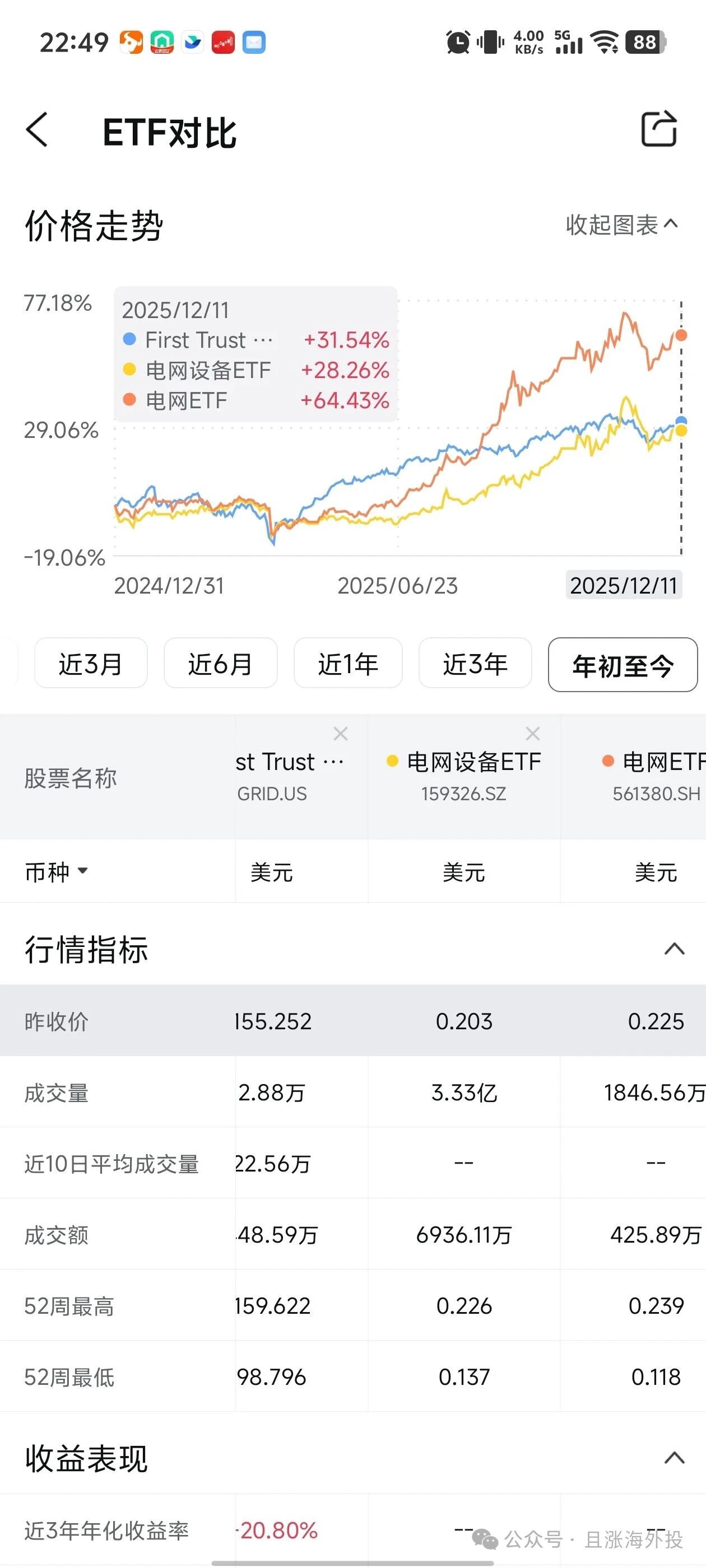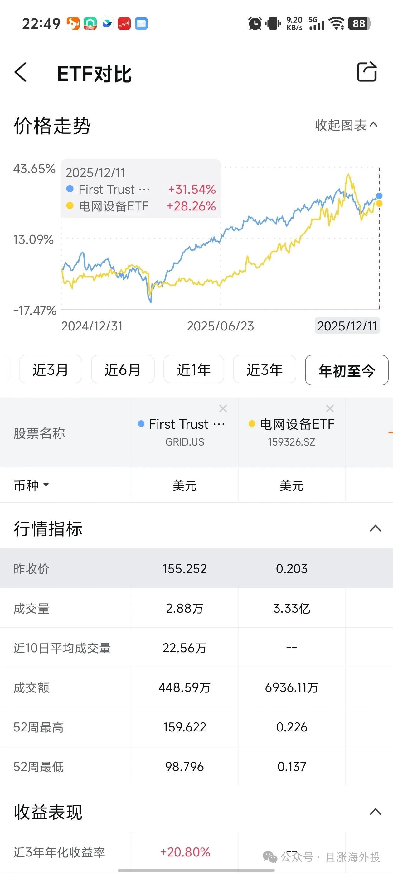 其实在美国也有专门的电网设备相关的ETF,比如GRID,这代码简称也很好记,就是线缆的英文名称,比如我们中国的电网大央企,国家电网,英文名称就叫State Grid。我把GRID ETF和我们中国的两个电网设备ETF做了对比,整体看今年回报是比较接近的。