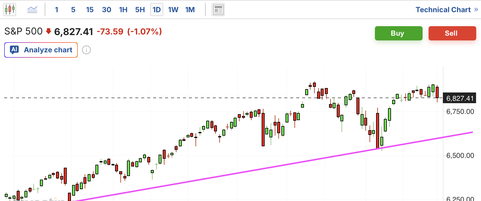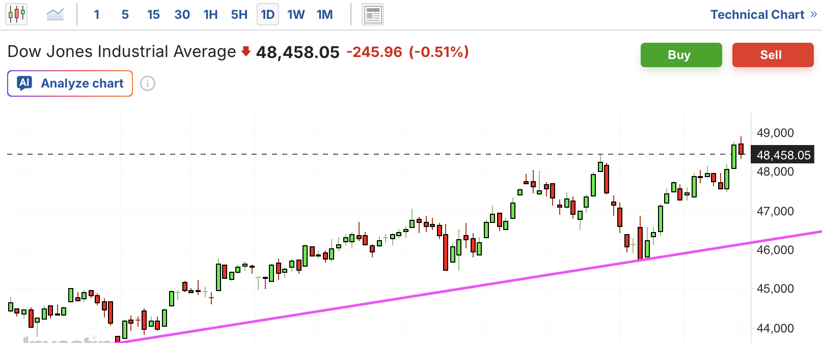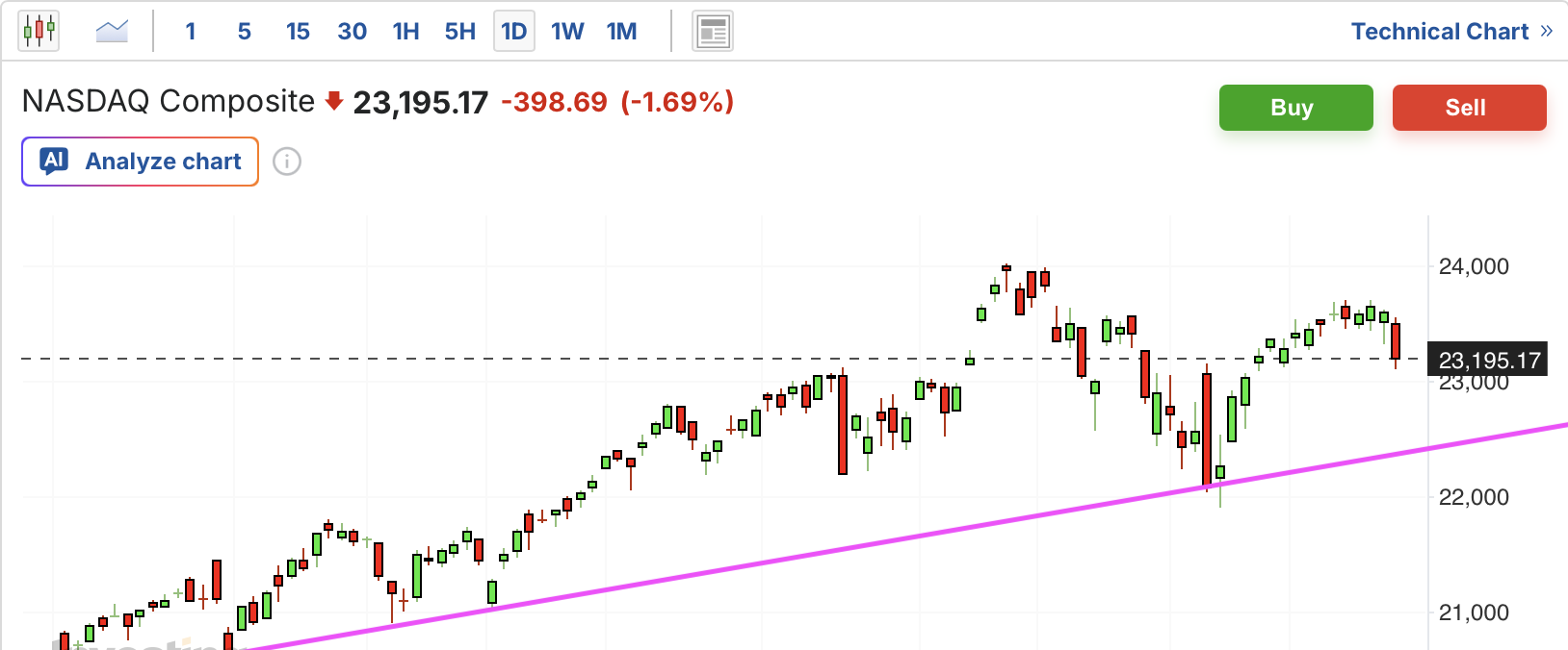 美股三大指数—中长期趋势继续维持震荡上行格局。在经历短暂回撤后,三大指数曾成功反转并再次确认上行。然而,周五走势出现全线大幅回调,显示短期抛压强大。纳斯达克和标普500指数周五均放量大跌,短期上升趋势线已被跌破,形态上出现短期恶化。道琼斯指数在突破前期高点压力位后,未能守住突破成果,大幅回落,但中长期上升趋势线仍保持完好,多头格局的稳固性正面临短期考验。