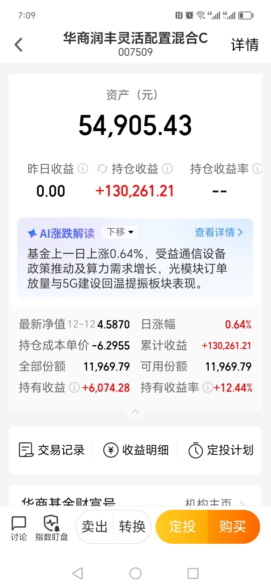 #青禾创作计划#在天天基金耕耘了十多年,今年才悟出点门道,那就是: 与优秀基金经理共进退,才有可能吃到肉。我今年5月清空了亏损4年的药基40万,分4批满仓杀入胡中源管理的招牌基,华商润丰灵活配置混合C(007509),做高抛低吸,半年多一点时间,收益不错。现在基金经理大幅减仓股票持仓,我也跟着减仓,效果不错。也增强了我的投资信心,我准备长期拿着它,不清仓,不定期加减仓,与基金经理共享投资快乐!