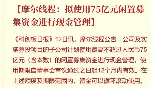 这太离谱了吧兄弟们,就在昨天,摩尔线程宣布将使用75亿元闲置募集资金进行现金管理,用来投资一些安全性高、流动性好的保本型产品,这消息一出,惹不少股民