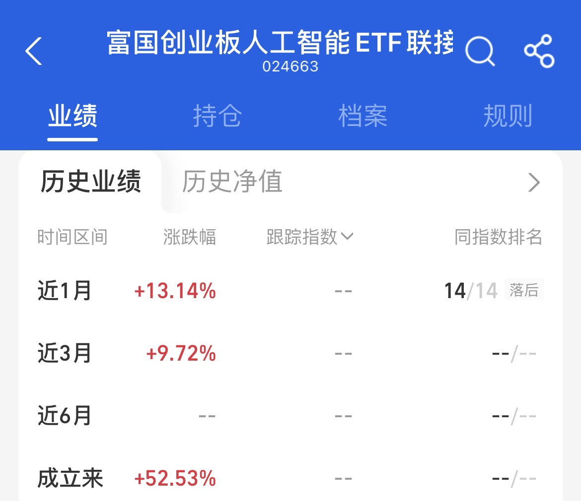 今天股市再次走低,不过人工智能又再度上涨了,从长期来看个人觉得科技的弹性还是挺不错的。像我前面买入的$富国创业板人工智能ETF联接C$ 它的持仓选取的大多都是Ai赛道核心硬科技实力企业,成分股包括中际创旭, 新易盛等等。近期走势先涨后调整,也是挺正常的。前面连续上涨5天后,小幅调整今天指数又涨了,而且估值还不高,我顺势布局了,继续吃肉