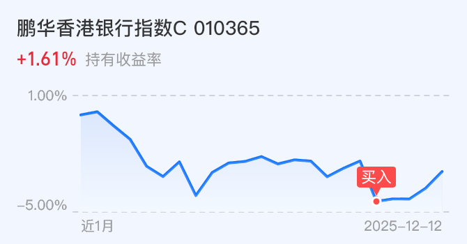 银行板块自7月份见顶以来已持续调整105个交易日,最大回撤达16%,风险释放较为充分,当前或已迎来较好的布局窗口。该基金跟踪香港银行指数,成分股既涵盖国内大型银行,亦纳入汇丰、渣打等国际银行业龙头。上周汇丰与渣打股价双双创下新高,主要催化因素为美联储上周三宣布降息25个基点,为国际大行带来显著利好。整体来看,当前银行板块股息率达3.94%,相较于十年期国债收益率溢价2.08个百分点,有望持续吸引中长期资金增配。看好板块未来表现,今天我继续加仓。