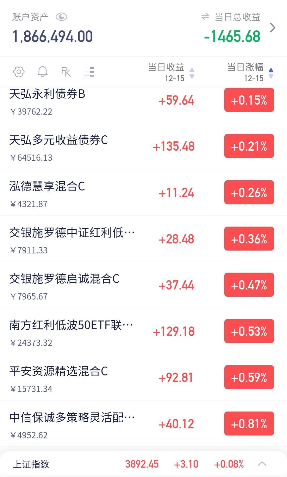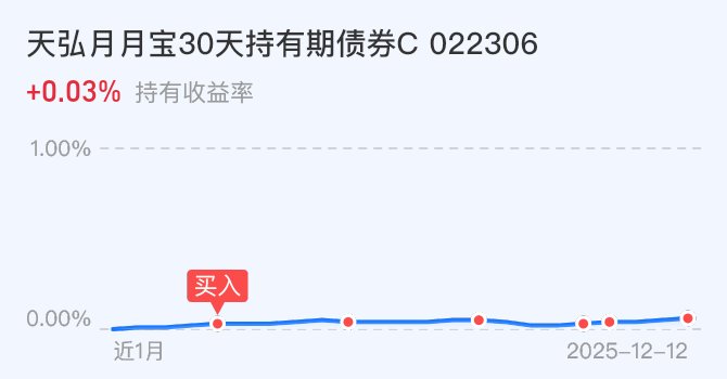 我加仓$天弘月月宝30天持有期债券C(OTCFUND|022306)$+2万元,进入12月不管债市如何震荡这支月月宝都稳稳的收蛋。因为这支月月宝纯债以信用债为主。今年以来涨幅2.20%,轻松跑赢余额宝和银行一年定存。虽然近期有政策宽松的利好消息出台,给市场带来了一丝暖意,但这并没有改变债市短期调整的整体趋势,市场依然处于震荡波动的状态。年末还是买信用债为主的债券来布局防御型基金,再说信用债为主的纯债是以确定性高的票息收益为主。属于低波动稳健收益纯债品种。并且由两位基金经理在严控风险的前提下获取稳健收益。讨论区六楼有加仓包可领。今天我继续领包大额上车了!
