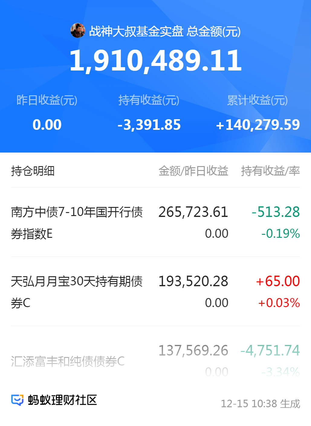 我加仓$兴全招益债券C(OTCFUND|018598)$+8000元,今天趁股市小幅调整逢低加仓,上周五股市企稳反弹但是受美股下跌影响出现调整。不过今天多数股票还是上涨的,尤其是持仓的电力,白酒,有色金属出现上涨。这支固收+布局是以一成股票,布局了港股和A股多个板块的龙头股。主仓为债券是以稳健信用债为主,附加少量利率债和可转债,整体以债券确定高的票息收益为主,附加权益增强收益,年底市场出现波动正好是低吸布局时机,备战明年春季行情。这支固收+近一年涨幅4.54%,属于低波动债券增强型,当前还是慢牛市场,配置股债搭配的固收+可以对冲单一市场风险,今天继续加仓一笔增加仓位。