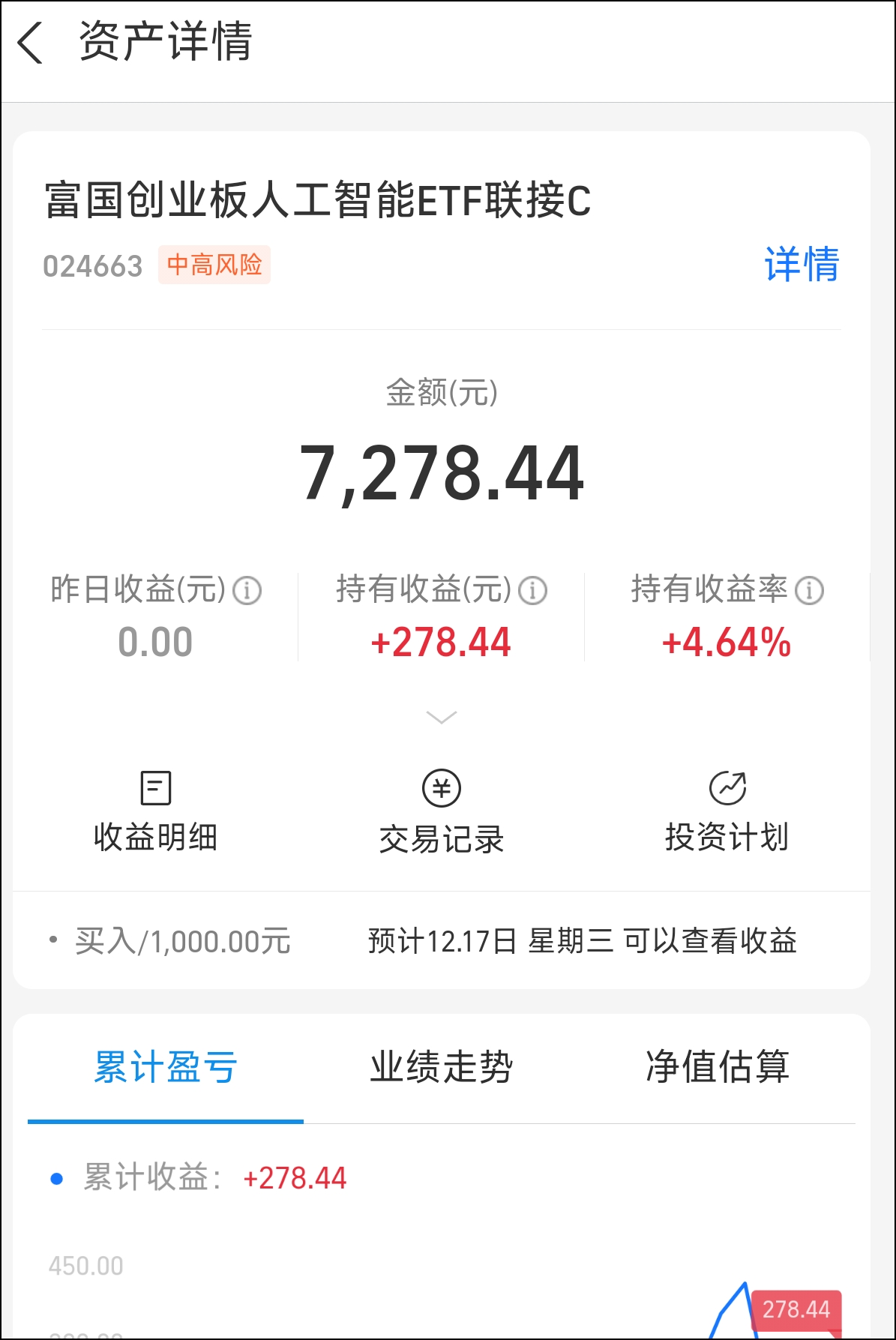 $富国创业板人工智能ETF发起式联接C$ 已经有一些仓位了,今天在小加一些吧,距离这个2025年收官也要完成了,整体科技方向有所上扬,其中人工智能的方向一直是政策支持地方,资金交易量比较活跃,明年还有希望延续一波,我选择在这个位置低吸一波吧,目前已经4个点的收益了!