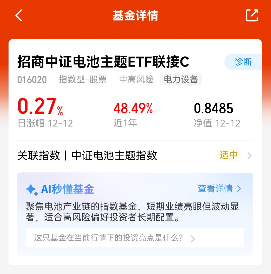 受到外围因素影响,今日A股市场开盘回调,电池赛道也呈现下跌,但行业基本面支撑仍然强劲,其中国内首条大容量全固态电池产线刚建成投产,能量密度直接翻倍, 计划2026年装车测试,所以短期波动不改长期上涨趋势,特别是$招商中证电池主题ETF联接C(OTCFUND|016020)$聚焦电池全产业链,近六个月涨幅超62%,业绩表现十分亮眼,我觉得后市行情仍然值得可期!