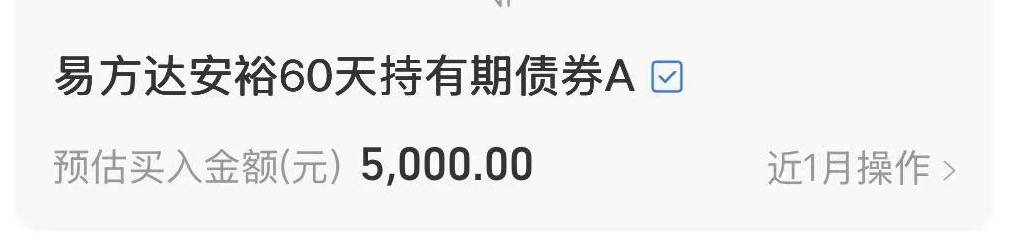 信用债:趁着债市震荡继续上车$易方达安裕60天持有债券A$ +5000元,现在的行情还是稳健类型比较省心,隔壁波动太大,利率债震荡碎大蛋,余额宝的闲钱我继续配置易方达安裕的仓位,信用债策略,定位低波动稳健型,近期债市震荡回撤控制非常好,行情只要不是大回撤基本能稳住或收蛋,上涨的时候也能够跟的上行情,自9月26以来仅绿了2次,基本上不用操心行情问题,主打一个稳,近一年收益率2.11%,回撤仅0.09%,不仅收益稳定,回撤控制的相当不错,60天持有期,买入后就不用天天盯盘,专业的事交给基金经理,我安心躺平收蛋就好。
