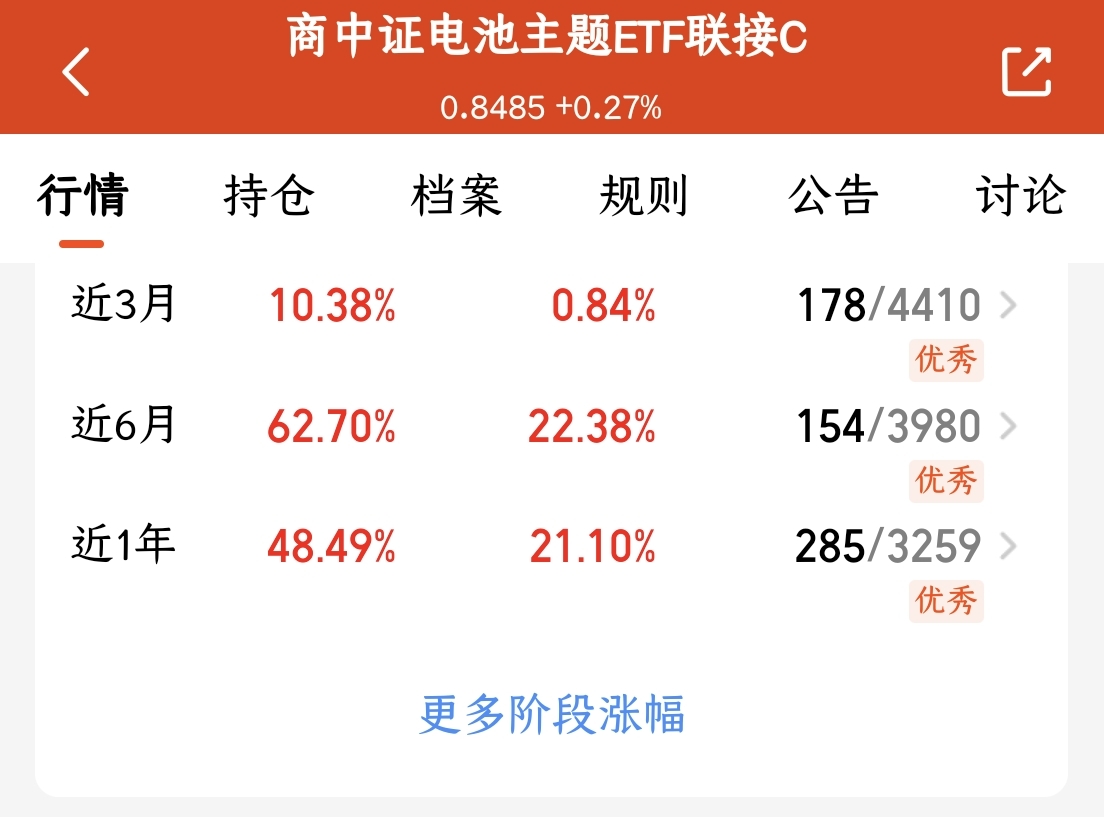 今日A股低开震荡,电池赛道也出现了回调,但行业基本面并未走弱。近日国内首条大容量全固态电池产线投产,能量密度实现翻倍,并计划于2026年装车,长期成长逻辑依然坚实。考虑到短期波动恰是布局良机,而且之前也调整了一段时间了,目前位置比较合适,我打算分批布局$招商中证电池主题ETF联接C(OTCFUND|016020)$。这只基金覆盖电池全产业链,近六月涨幅超过62%,业绩表现突出,坐等吃肉。