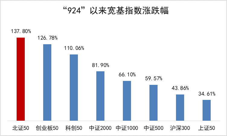 最近跟身边的投资者唠嗑,发现大家的话题焦点都绕不开一只指数——北证50。自2024年9月24日一揽子稳市场政策落地后,这只曾经略显“小众”的宽基彻底爆发,截至12月5日累计涨幅高达134.82%,不仅远超沪深300、中证500等传统宽基,就连科创50、创业板指等同类型成长风格指数也被远远甩在身后,堪称宽基圈“最靓的崽”。