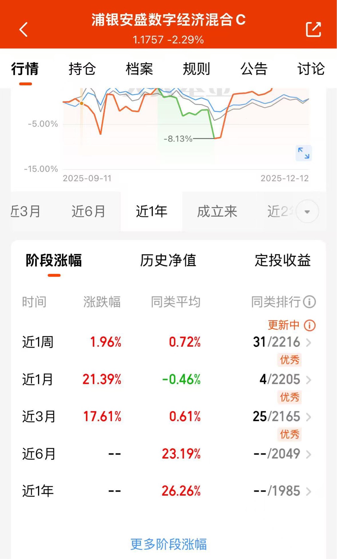 #AI泡沫担忧再起:AI链美股遭抛售# 新人就是猛!$浦银安盛数字经济混合C$ 近一周业绩还是顶,能涨抗跌,CPO后续还能涨,先上车再说!#茅台批价两日涨近百元!白酒挤泡沫结束?#