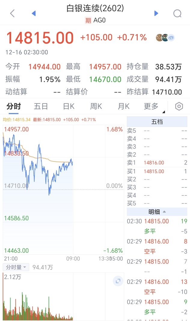 再看咱们国内市场,情况就平和多了: 沪银期货今天没交易,但收盘价 14815 元 / 千克,比昨天涨了 105 元,涨幅 0.71%,最高冲到 14957 元,最低也守住了 14670 元;白银 T+D 现货报 14661 元 / 千克,虽然微跌 8 元,但波动特别小,最高 14941 元、最低 14660 元,几乎没什么跳水风险。