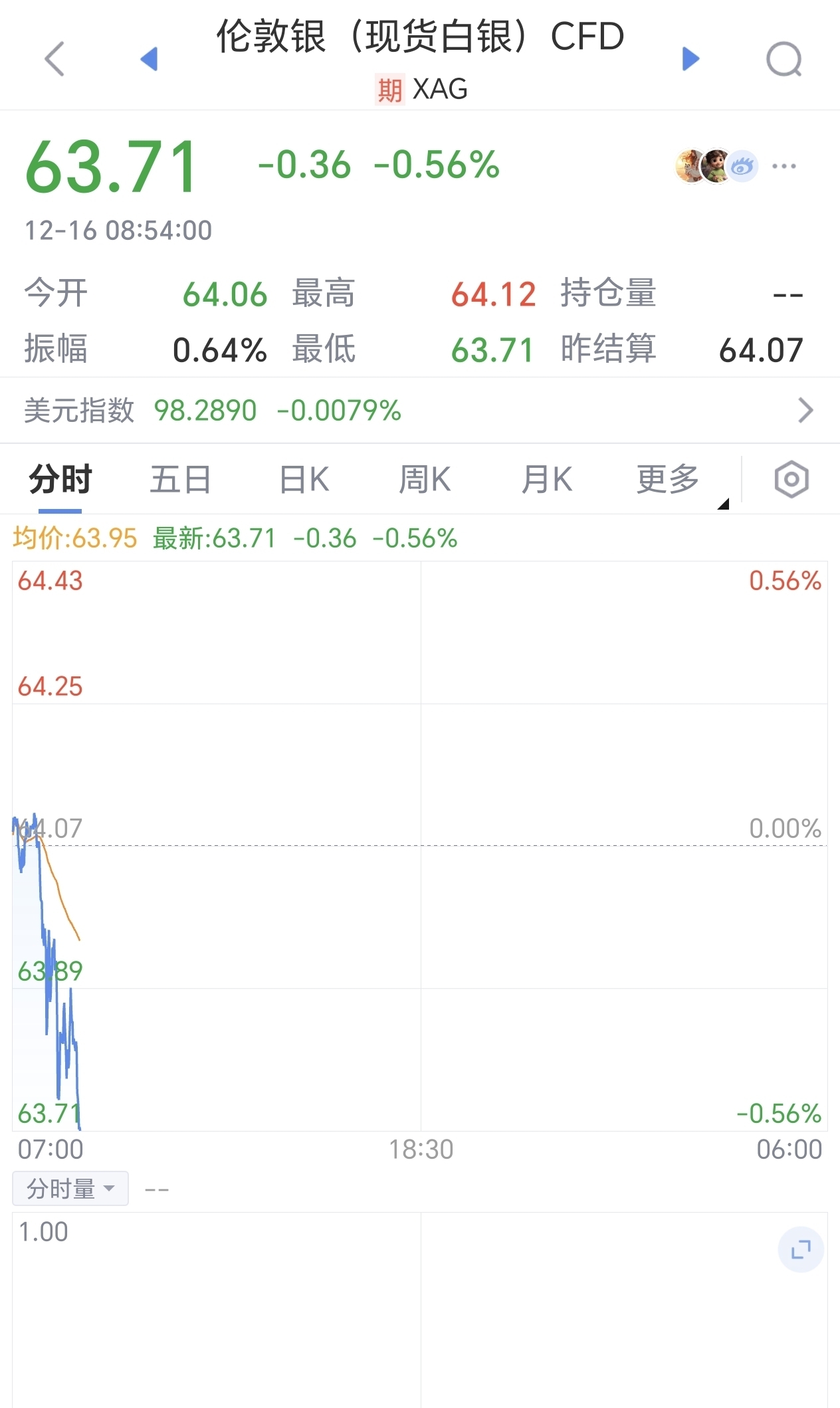 今早打开国际盘直接看愣了!伦敦现银开盘才 61多一点,没想到半天时间就冲到破64美元的高点,最高涨幅飙到 3.41%,现在还维持在 63.6 美元左右小幅震荡。