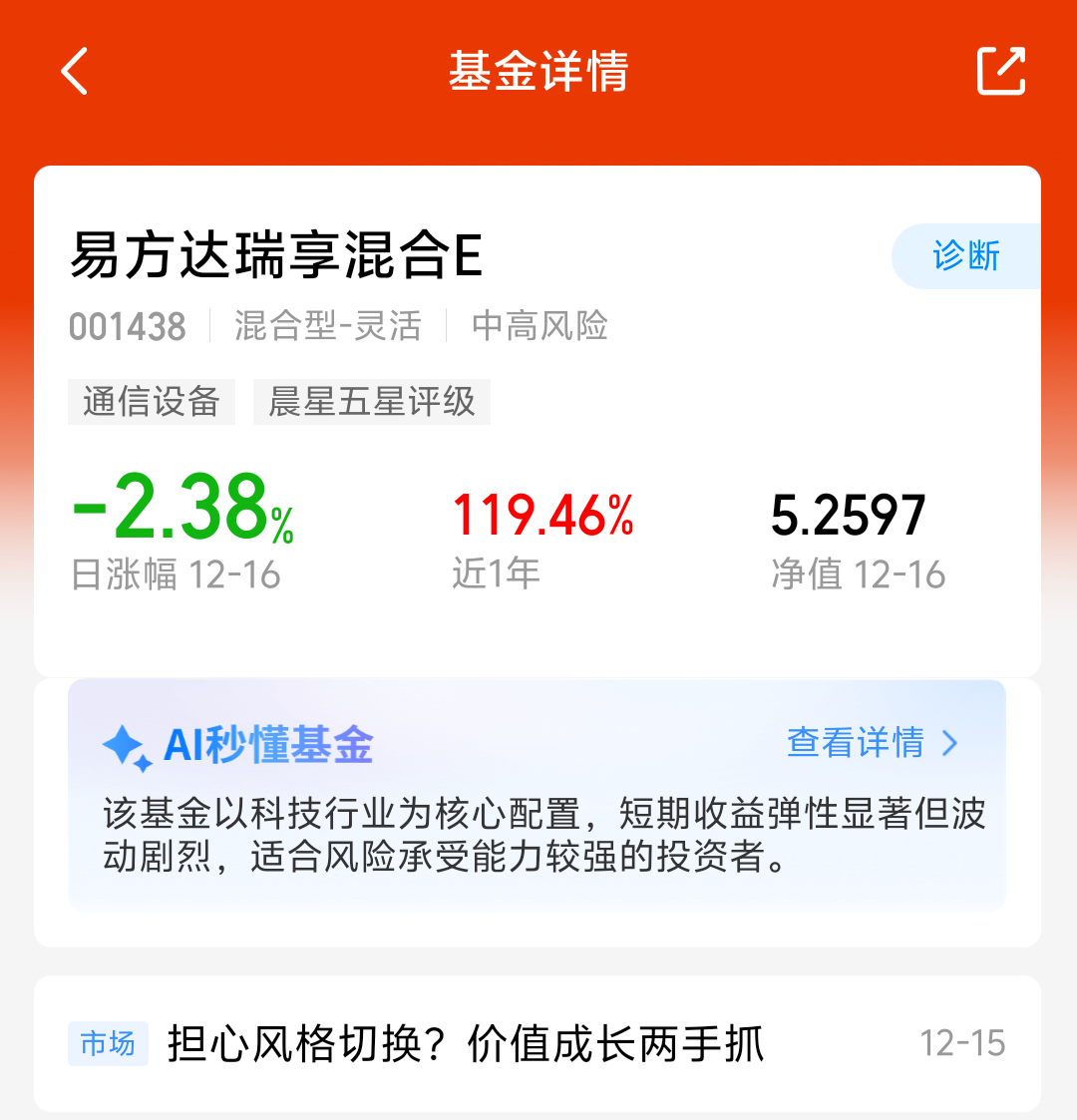 大盘今天回暖上涨,三大指数集体涨了不少呢,CPO板块今天太给力了,易方达瑞享混合E持仓聚焦CPO板块,近一年涨了119.46%,成立以来涨幅超400%,业绩还不错,经理调仓能力不错,看好这个方向,我准备分批布局了!