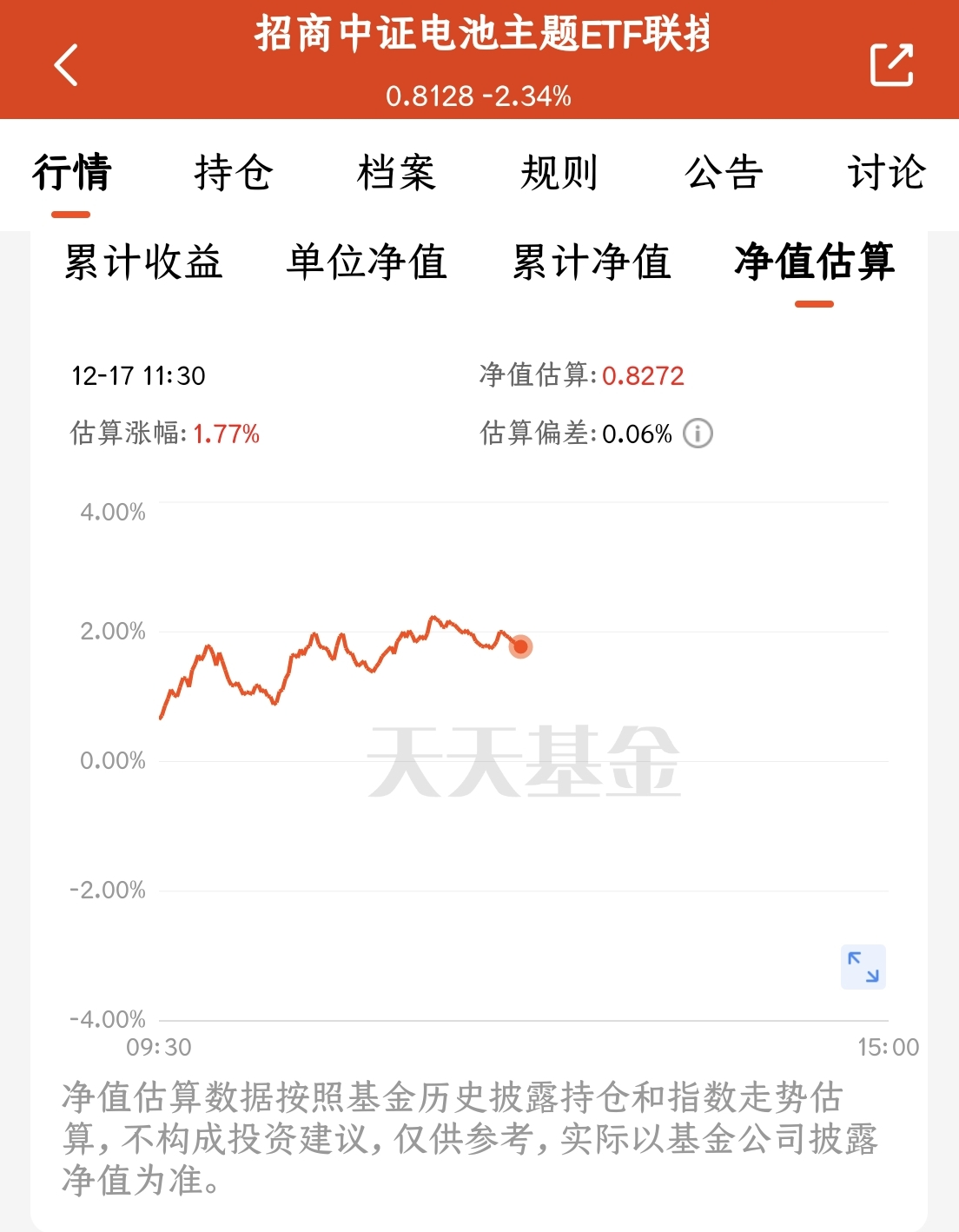 今天股市反弹,三大股指全线飘红,电池板块表现也比较强劲,其中$招商中证电池主题ETF联接C(OTCFUND|016020)$目前估值上涨1.77%,该基聚焦