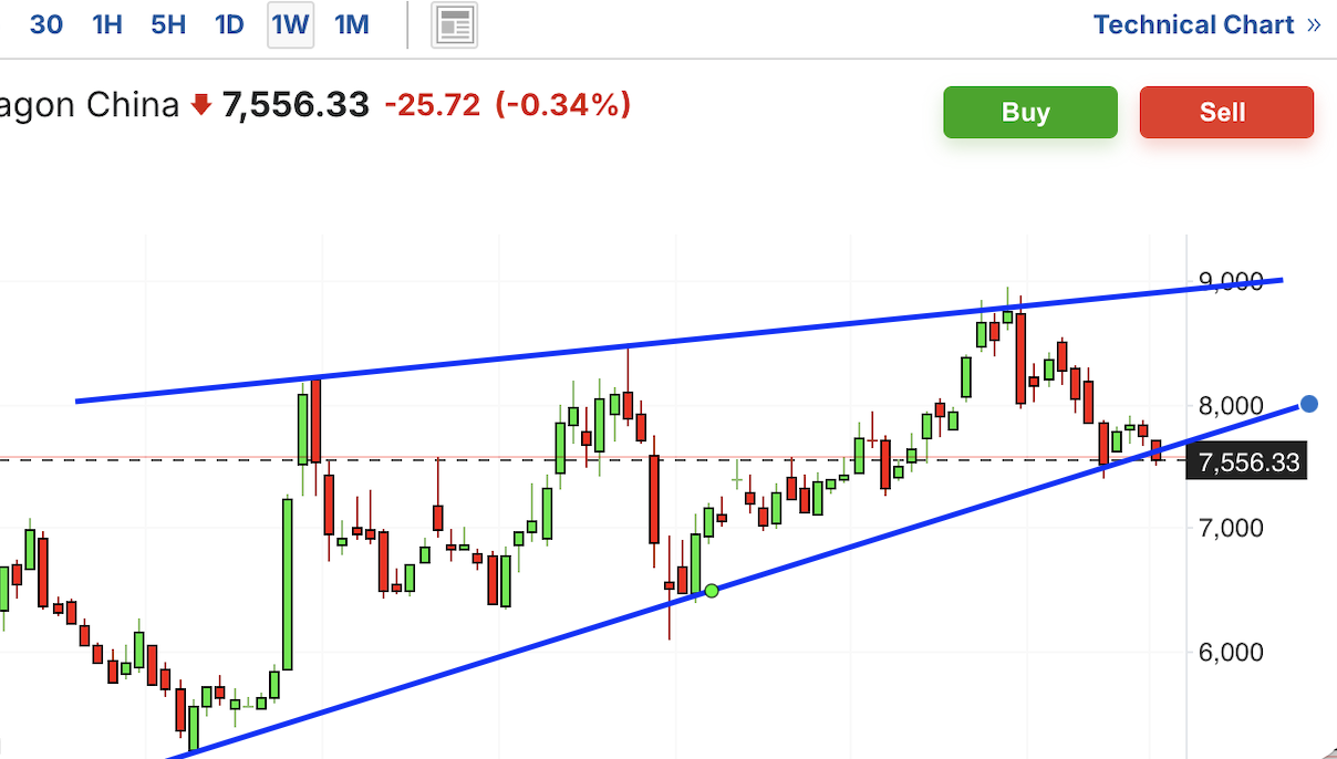 中概股:该指数近期处于宽幅震荡整理区间,形成上升楔形。短期指数在通道上沿遇阻后回撤,这两日已跌破通道下轨支撑线。若确认有效跌破,则可能就此展开下行趋势。
