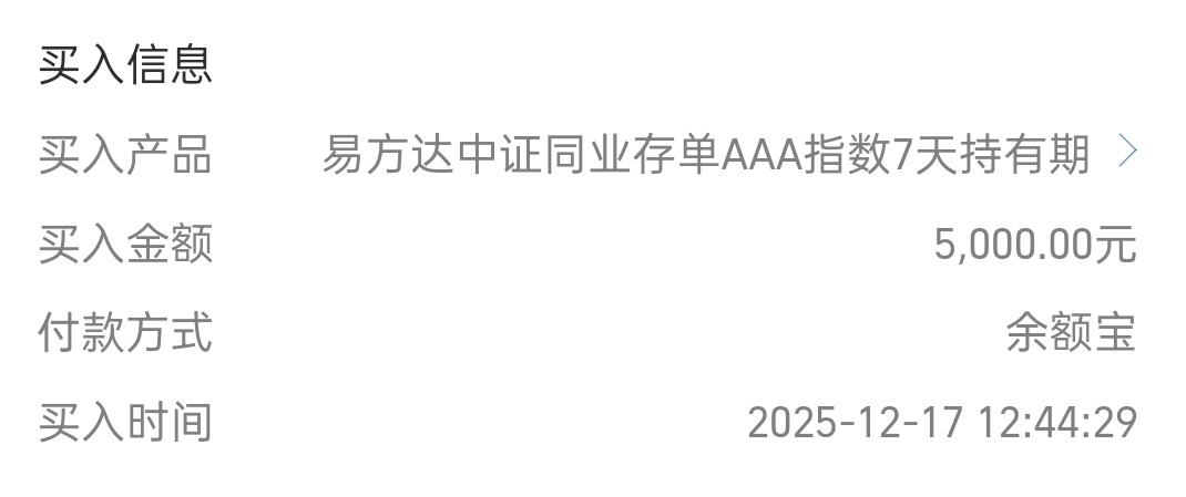 近期股债震荡较多,手里闲钱想增值又不想又太大的波动,看来看去还是存单最安稳!$易方达中证同业存单AAA指数7天持有期$ ,这是一支7天持有期灵活度高,就算后面用钱7天后也可以灵活取出,完美适配闲钱打理的需求。而且稳定性也很好,近三月仅碎了一个蛋,波动几乎看不到。在当下股债震荡频繁把闲钱放在回撤小,稳定性高的方向更安心。现股债市场分化,纯债频繁调整、纯股波动较大,这种稳健型债基刚好适配,把闲钱存这里,既能避开市场风浪,又能比货基多赚一些,真的很不错,持有体验感也很舒适,今天个人继续+5000。